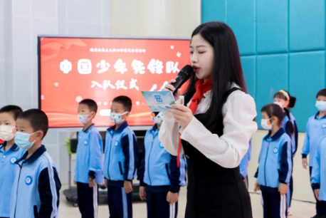 学校少先队总辅导员毕崇欢老师宣读新队员入队决定后,高年级的队员们,双手捧着象征光荣和使命的红领巾,为二年级新队员们一一佩戴。