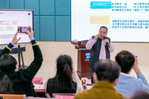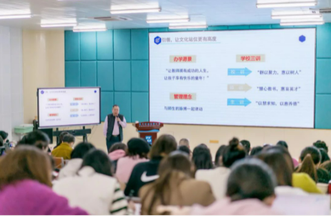 “情怀,让教育人生更有温度”,黄校长的“人生三问”诠释总结了他一生对教育的追求。其“成人达己”、“摆正心态”的观念更体现了他对教育的“情怀”。他引用一番充满力量的语言表达了自己对教育共同体的希望,即个人努力与团队合作相结合,乘风破浪,一往无前。