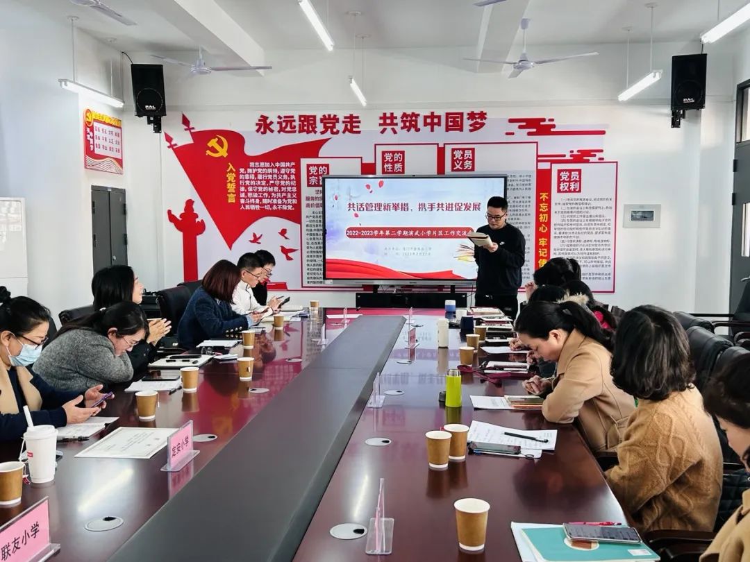 联友小学则从党建引领、自主研修、名师引领、集中研修、以赛促练五方面,分享了老师们学习贯彻新课标理念的点滴经验。