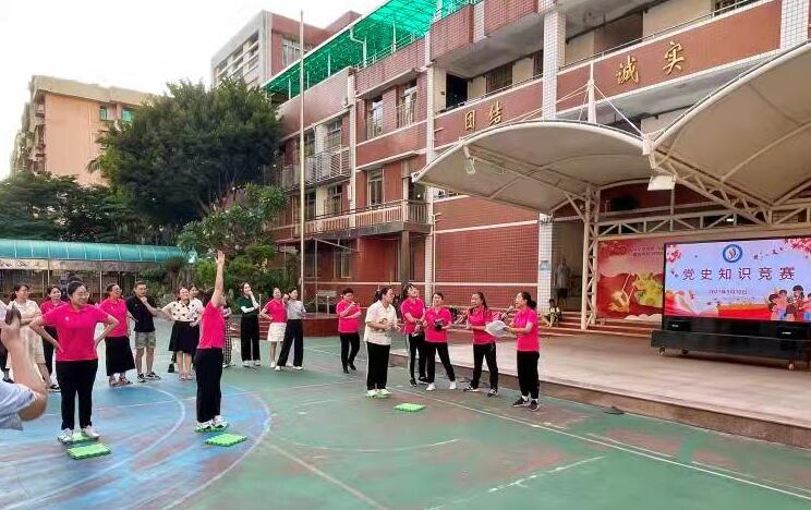 首先进行的“巧渡金沙江”比赛,参赛队员分两队立于起跑线后,随着裁判的一声令下,教师们迅速进入比赛状态,各组教师相互鼓励,为参赛的教师呐喊助威!比赛期间,裁判员随机暂停,穿插党史知识竞猜题,待小组合作抢答党史知识问题正确后,方可继续前进。活动中,老师们再次温习了党史知识。这不仅仅是对教师身体素质、党史知识的检阅,更是对意志和毅力以及团队精神的考验。