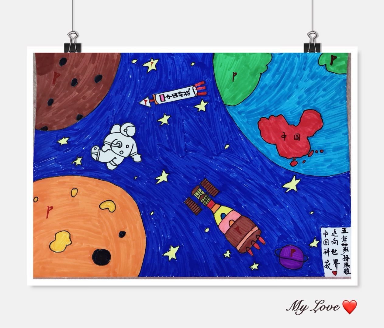 五年(3)班郑茗尹同学说:“中国的发展到现在,真的很不容易。航天员叔叔们,你们辛苦了!”