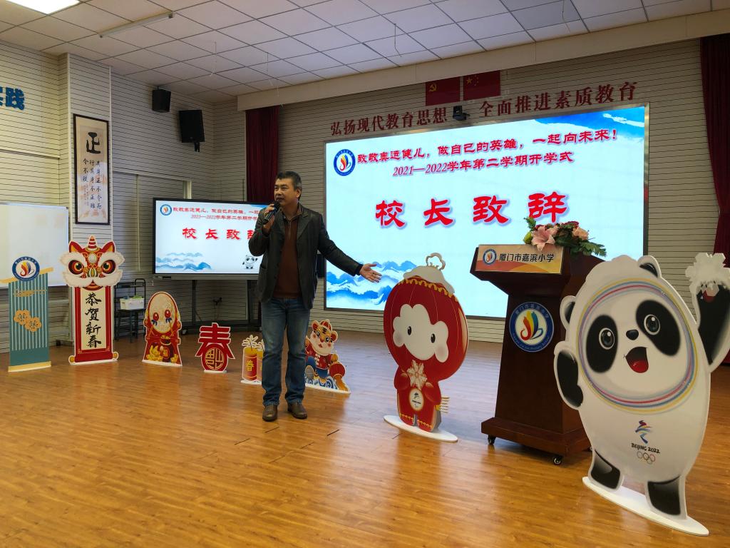 2022年2月16日,嘉滨小学喜启新学期,元气迎开学,冰墩墩、雪容融、虎年元素的背景板迎接“虎”娃们的到来,希望他们“虎”力全开,奔赴新学期。全体师生怀揣着对美好未来的憧憬,嘉滨小学春季开学仪式开始了!