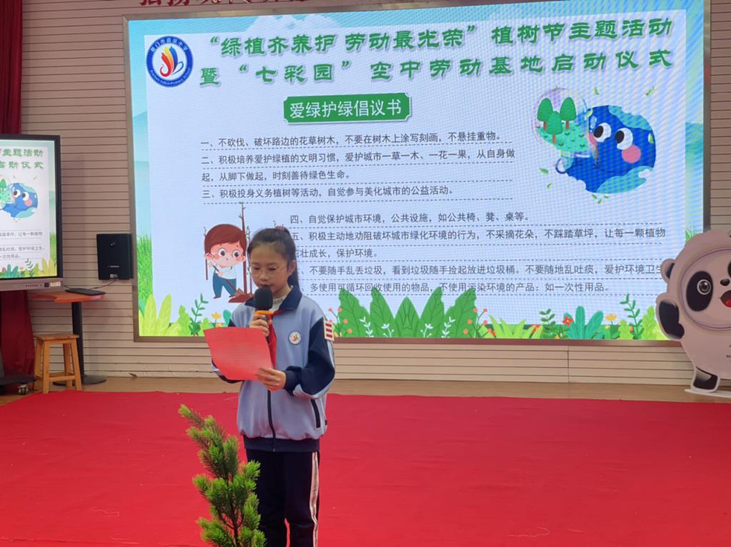 最后由大队委宣读《“爱绿护绿”倡议书》,倡议同学们爱护校园中的一草一木,爱护我们这个城市中的一草一木,珍爱周围的一山一水,规范自己的一举一动。作为小学生的我们平时应该善待每一张纸,那是对树木的尊重,少用一次性餐具,那是对树木的珍爱,从身边小事做起,争做绿化宣传员、环保小卫士。