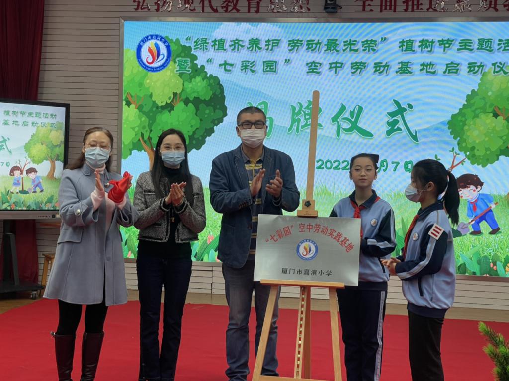 活动伊始,德育处揭开了“空中劳动基地”的神秘面纱,校长讲话并宣布正式揭牌启动——厦门市嘉滨小学“七彩园”空中劳动实践基地。在美丽的校园里,一个绿色的梦想又一次酝酿,一个绿色的希望又一次启航。该基地为校园引领绿色风尚奠基,开启嘉小少年的绿色种植之旅。