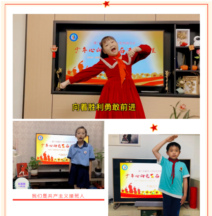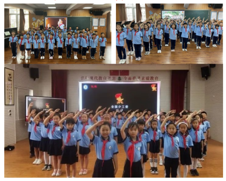 在学校少工委的领导下,各中队辅导员、音乐老师有序组织,我校少先队员和即将入队的少年儿童在鲜艳的队旗下敬礼。在“我们是共产主义接班人……”铿锵有力的《中国少年先锋队队歌》歌声中,少先队员们唱响新时代的乐章。高亢的队歌和庄严的誓词激励少先队员们从小爱党、爱国、爱人民,努力学习、锻炼身体,树立远大理想抱负。