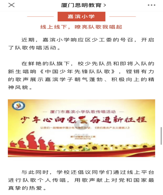 为深入贯彻习近平总书记关于少年儿童和少先队工作的重要论述,迎接党的二十大胜利召开,我校响应区少工委号召,纪念队歌起源,传承红色基因,培养少年儿童坚定跟党走,争做新时代好队员,开展了2022年厦门市嘉滨小学队歌传唱活动。