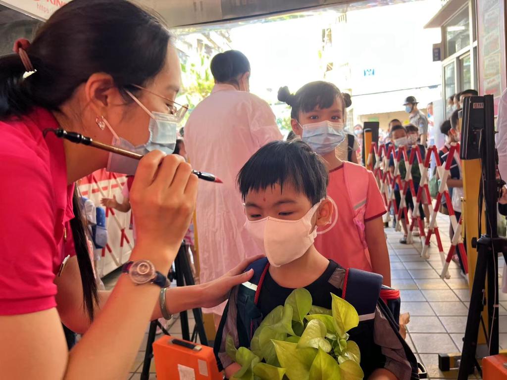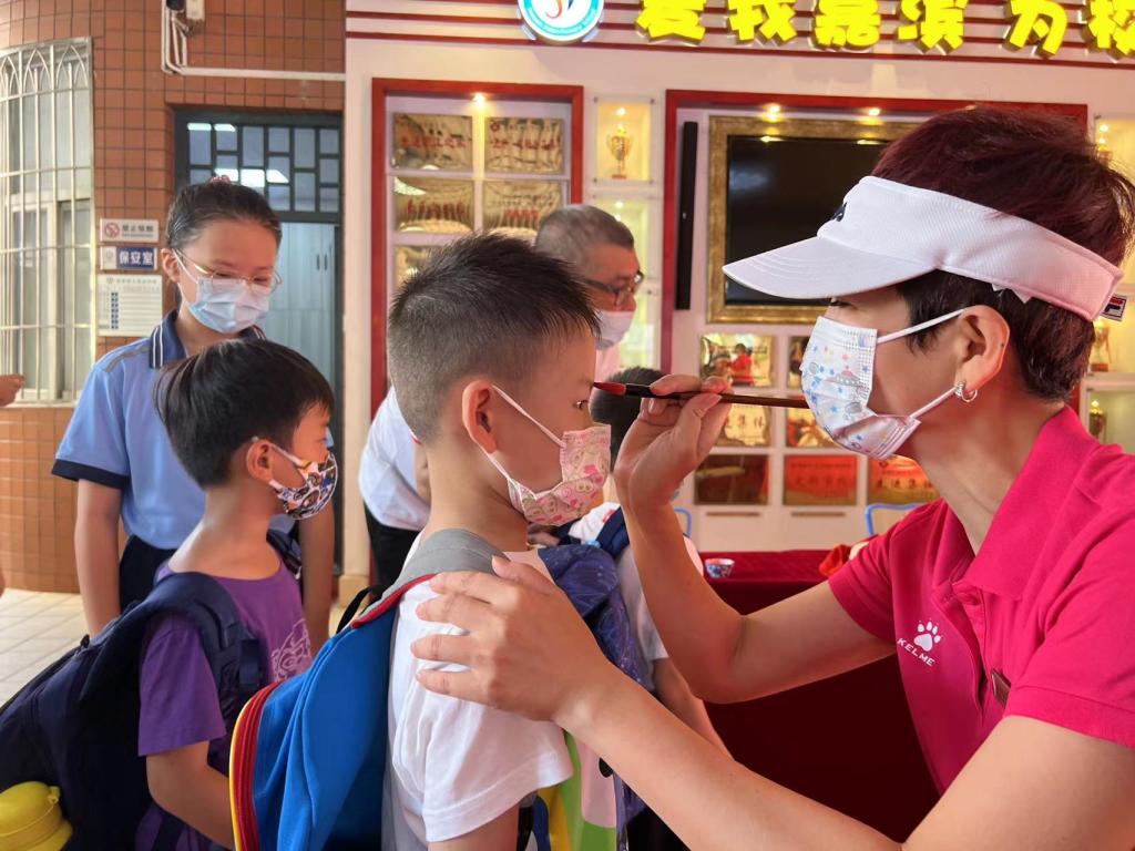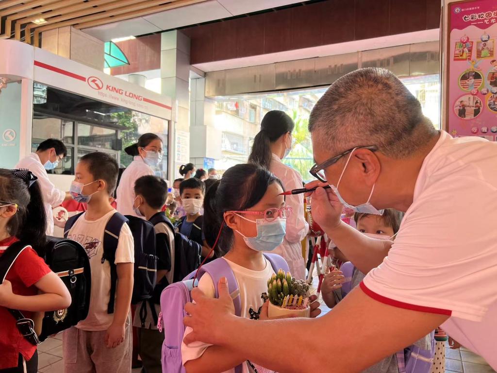 随着校长振臂一挥击鼓鸣志,“砰!砰!砰!”的鼓声响起,激励孩子们勤学奋进,大门开启,初来乍到的萌娃们即将收获一波惊喜!行政团队为每一位一年级的小朋友们朱砂启智,期许他们成为善思乐学的孩子,秉承“志存高远,全面发展”的校训成为新时代好少年。