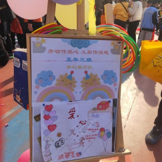 操场上,一个个五彩斑斓摊位搭建,一组组琳琅满目的商品陈列。同学们亲手制作了海报、爱心义卖箱及各种各样的广告牌:“买三送一”,“老板虽小,诚意十足”,创意十足。整个操场人头攒动,叫卖声此起彼伏。同学们穿梭与各个摊位。询价的,砍价的,拉顾客的,一派热闹景象。同学们纷纷表示,能把钱捐给需要帮助的人,这样做很好。