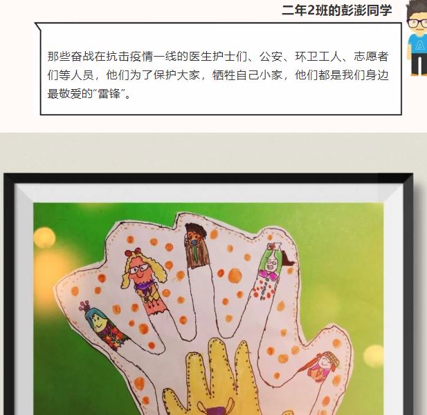 活动引导同学们赶快用手中的笔描绘出心中的“活雷锋”形象,可以作画也可以写文章,还可以拍摄相关的视频上传。活动一经推出就得到同学们广泛的响应,一个月的时间,收到了大量优秀的作品。雷锋精神在新时代的体现孩子们已经知晓,相信未来,他们也能成为愿意为社会服务,奉献的人。