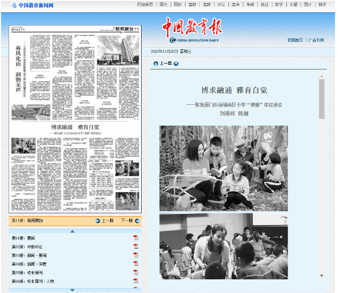 近年来,厦门市前埔南区小学的课程建设取得了显著成效,极大地推动了学校的发展。学校先后荣获“全国中小学百佳教育研究单位”“全国学校文化建设创新实践基地”“全国生态教育示范学校”等荣誉称号。学校陆续接待来自全国的教育参观团,在一定区域内产生了积极影响。展望未来,学校将继续优化“博雅”课程体系,促进学生全面而个性地发展。