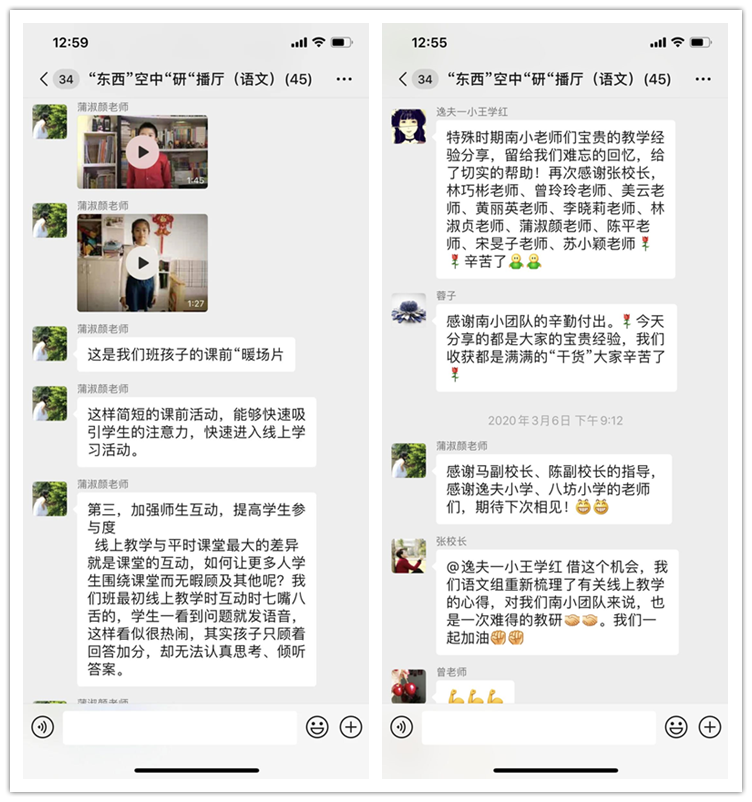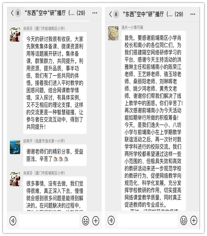 临夏逸夫第一小学和八坊小学的老师们纷纷表示在这样的研讨中受益匪浅,为他们解决了教学中的困惑。逸夫第一小学的鲁可娟校长十分感谢前埔南区小学肖校长和南小的各位同仁们为他们搭建隔空网络研修学习的平台,解决了线上教学中的困惑。通过开展跨越时空,网络交流的校际教研活动,他们不仅认识到了网课实施中的问题,而且有了明确的努力方向,也为三校教师创设一个交流合作、互动学习、展示自我、锻炼提高的机会,还为校与校之间的学习和交流提供了平台。八坊小学的马阳梅校长真诚地感谢南小精心谋划的线上教研活动,老师们分享的经验具有居家学习的针对性,有效性和可操作性。但愿以后有更多更深更广的学习与交流,让厦门前埔南小优秀团队的大爱洒满临夏市八坊小学!