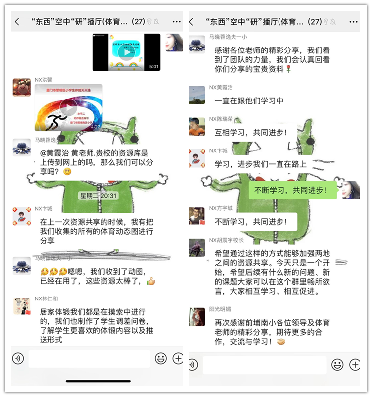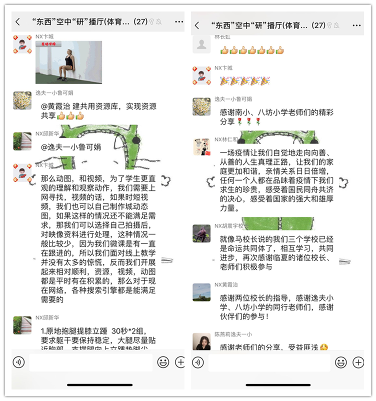 首先,黄霞治老师跟大家介绍体育组在这特殊时期开展线上教学的备课经验。沿用体育人分工合作、团结互助的一贯风格才能实现共赢。针对“学生在家锻炼,受场地和器械限制,无法开展过多活动”的问题,卞城、郭意萍和许贻敏老师分享如何精心挑选以“小场地、小范围、简易的器材、以及核心力量和柔韧性项目”为主要教学内容并自编自导自演自录微课的宝贵经验。电脑小达人卞城老师介绍如何搜集和制作动态图,让学生更直观地理解和观察动作。邱新华老师举例分享体育线上课的一般流程。接着,各个体育老师展示了自己线上教学课程和学生锻炼成果展示的截图。“东西”空中“研”播厅瞬间沸腾起来,临夏老师们纷纷为南小体育老师们的团队意识和细致及时的评价方式点赞。最后,临夏老师们也分享了自己开展线上教学的宝贵经验,实现资源共享。