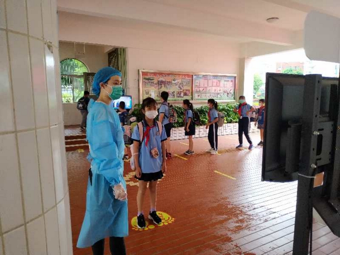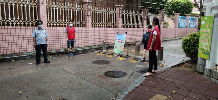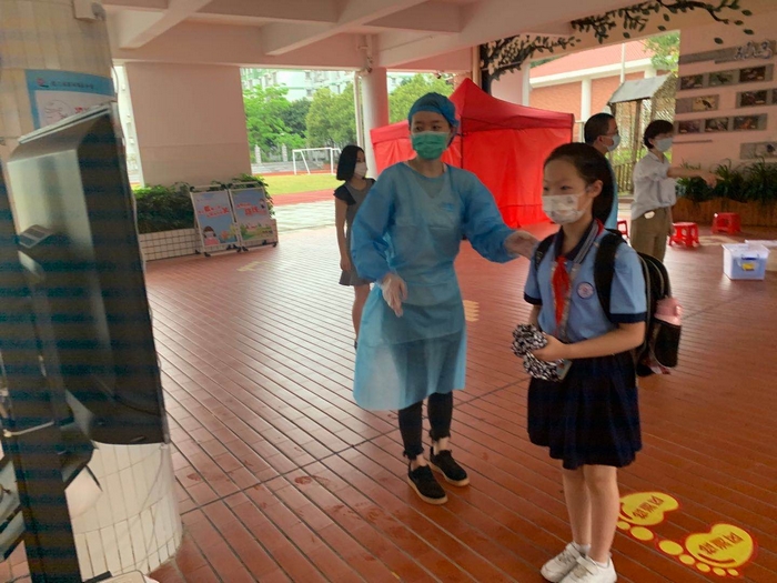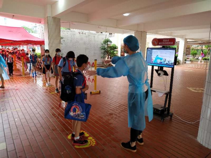 清早,迎着毛毛雨,熟悉的保安叔叔、导护师和行政人员早早地守在各自的岗位,静候孩子们的到来。先进的测温设备和贴心的指示使得入校体温检测高效而有序。