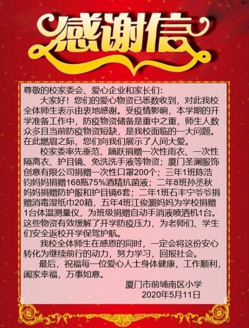 2020年5月18日上午,前埔南区小学3-5年级学生迎来了开学复课第一天。为确保孩子们顺利返校,学校整装待发,防疫消杀、体温检测、返校一日指南等等为归来的孩子们保驾护航。