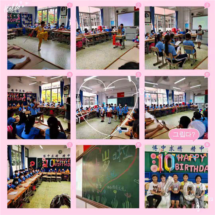 老师们为孩子们献上十岁的祝福,愿孩子们有“发奋识遍天下字,立志读尽人间书”的志向,有“宝剑锋从磨砺出,梅花香自苦寒来”的毅力,有“读书破万卷,下笔如有神”的底气,有“会当凌绝顶,一览众山小”的视野。