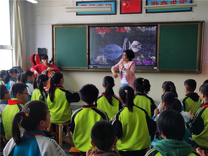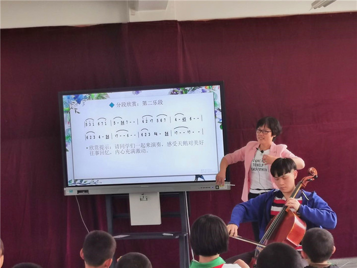 朱丹红老师良好的音乐素养,精湛的教学技艺,亲和的人格魅力,启发式的音乐引导,所到之处都给老师们留下深刻印象。在课堂上,她将音乐的聆听、感受、体验贯穿于教学的全过程,将音乐基础知识和基本技能的学习有机地滲透在音乐艺术的审美体验之中,通过聆听、哼唱、肢体动作表演等音乐实践活动,培养学生音乐审美能力,激发了参训老师和学生浓厚的学习兴趣。朱老师还带来了“合作伙伴”——上海音乐学院朱元丰同学,“母子齐上阵”,极富感染力的教学激情和精湛的演奏艺术,为听课老师和学生呈现了一次又一次的音乐盛宴。