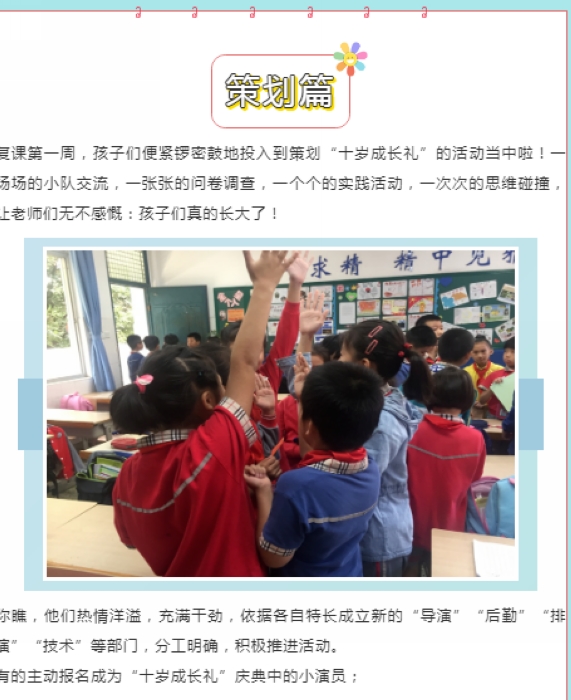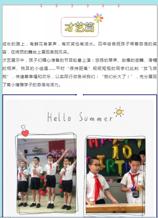 首先,分别由陈洪主任和高梦菲老师结合南小“六一系列活动”的策划和开展进行了相关的经验分享。围绕我校“凤凰花开,南小娃‘嗨’”的六一活动主题,两位老师立足学校和班级不同层面,从儿童节活动主题的确立说起,谈到儿童节氛围营造,再到儿童节精彩瞬间的分享,最后提炼儿童节活动推进策略四个方面,向临夏协作校的老师们全方位展示了我校“六一系列活动”的全过程。南小娃们欢乐十足、回味无穷的六一儿童节给协作校的老师留下了深刻的印象。老师们发出感慨:南小“六一系列活动”的策划和开展,有班主任推进活动的身影,有学生策划活动的实践,有学生展示才艺的精彩……处处体现着学生立场,在活动中定格了一张张南小娃灿烂的笑脸。