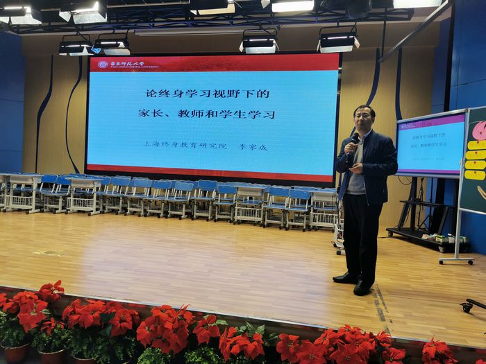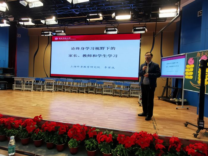 活动的最高潮则是由李家成教授带来的《论终身学习视野下的家长、教师和学生学习》的专题讲座。李教授提到学校教育是综合的,家长的介入是全面的,我们应在“尊重”“信任”“共赢”的基础上,结合学校、家庭、社会三者的合力最大限度地、完整全面地影响我们所做的教育。因此家校合作实践应遵循有思想、有结构、有情感、有境界的原则,家长应在学校教育参与中学习、在与教师的合作中学习;家长、学校、教师在共同领导下学习,在介入社区治理中学习。家长、教师和学生都应以终身学习实现终身目标。李教授从家校合作、隔代互助、作业研究等方面提到的一个个真实、鲜活而有温度的案例故事,让我们重新审视家校社合作的意义,开阔了我们的思维,让我们明白了其根本在于“人”的发展,落脚于“终身学习”。只有家长、学生、教师、社区社会人员相互学习、相互影响,才能共同建构起家校社教育场,最终实现共同成长的愿景!