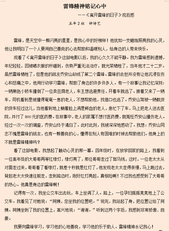 五六年级的同学们观看电影《离开雷锋的日子》后,感受良多。雷锋叔叔虽然离开了他的战友乔安山,但是却有众多战友在践行着雷锋精神,同学们也用笔写下了自己心中的雷锋!