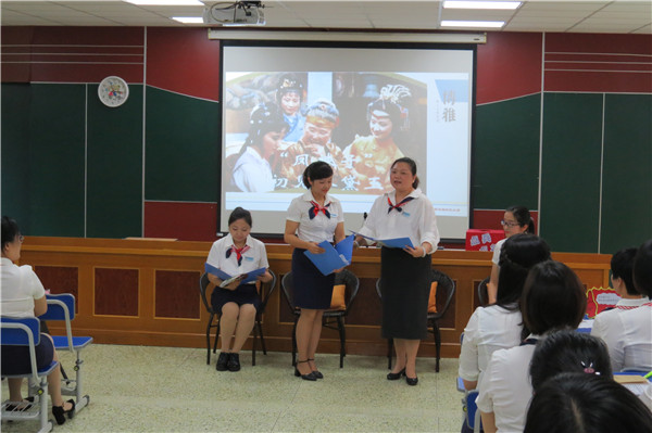 本次活动分两个环节进行,第一个环节是“阅读表演”技能展示。我校“阅读表演”课型研究已持续三年多,要指导好学生表演,老师必须先学会表演。按照惯例,我们教研组每次研讨活动,老师们都要进行“阅读表演”基本功展示。这次吴鹭梅、任佳妮、陈斯佩、陈莉恒四位老师为大家展示的是读者剧场——《凤辣子初见林黛玉》。四位老师向大家演示了如何通过不同的表情、语速和语调变化来传达不同的意义,从而走进故事中的人物。真是台上一分钟,台下十年功,扎实的表演基本功无疑将为课型研究打下坚实的基础。