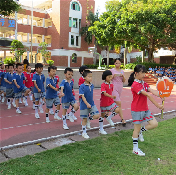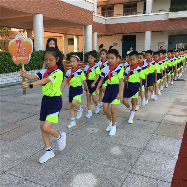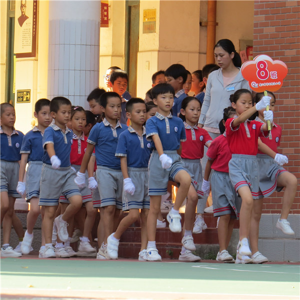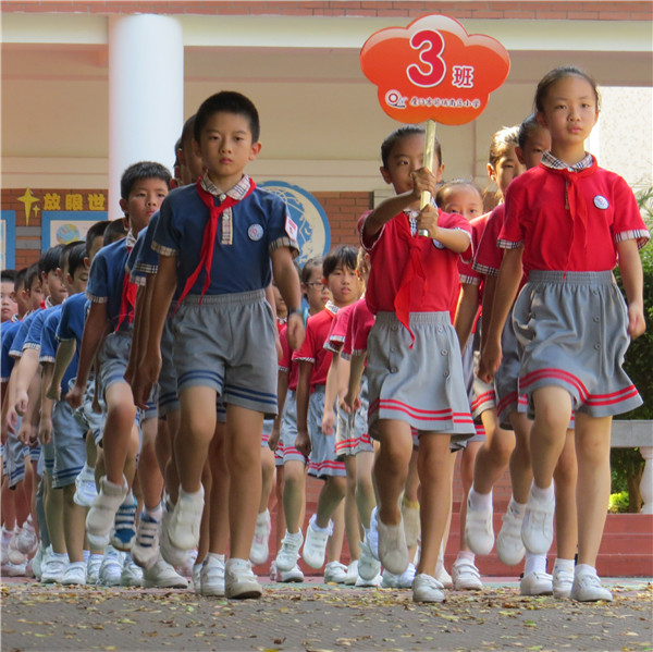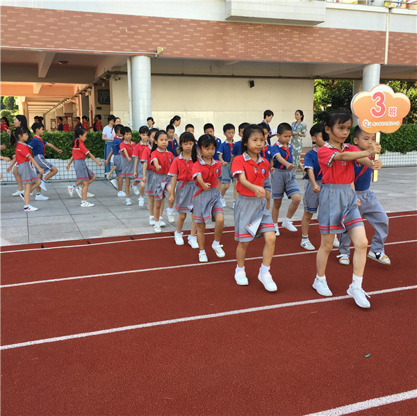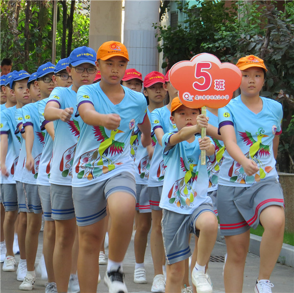 整齐划一的动作,响彻云霄的口号,俨然一副小小兵的模样!一个班紧接着一个班,在《义勇军进行曲》令人振奋的氛围里,学生们激情昂扬、意气风发地大步向前。在场的老师、教官都为孩子们高昂的斗志、团结一心的精神所震撼!(图2(1)-(14))