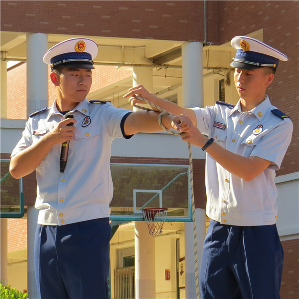 发生火灾,借助绳子沿窗户安全逃生是被困人的最佳选择。那么,如何在短时间内快速稳固地打绳结呢?在会操比赛结束后,教官们特别带来了消防救援绳结的展示。
