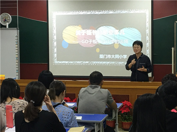 紧接着林老师跟大家分享怎样运用GO设计板书,林老师结合不同学科介绍了9种板书设计的方式。参加讲座的教师们也跃跃欲试,纷纷针对自己的学科评价起板书运用的时机与心得,其中肖校长更是结合自己的教学实践跟大家分享了数学板书设计的精髓。林老师还送给了大家一句私房话“练好学科性的简笔画,扎实教师的基本功”。