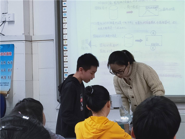 六年级刘微微老师执教的《圆柱圆锥的整理与复习》一课,教师单刀直入,让学生通过课前整理的思维导图回忆本单元知识的基础上,引导学生将圆柱、圆锥的特征、表面积、体积等方面内容进行串联,形成知识网络。陈明晓老师引领学生们“玩转”圆木,从“涂”、“切”到“削”、“挖”,不断拓展孩子的思维,通过探究形成解决问题思考的路线。两位年轻的老师将枯燥的复习课变得活力十足,在知识整理与查缺补漏的同时让学生有了新的收获。