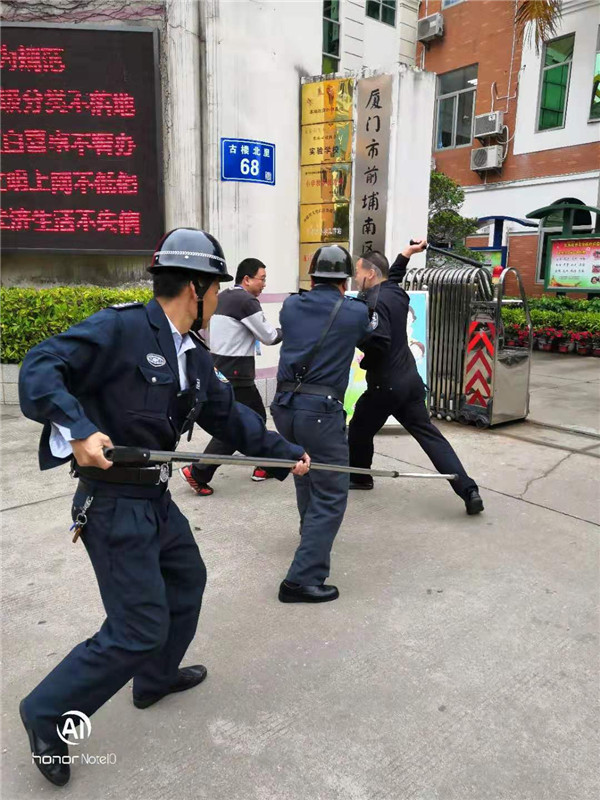 为检验我校在处置突发事件时的指挥应变能力和协调配合能力,提高全校师生紧急避险意识,今年以来,厦门市前埔南区小学每月定期举行“反恐防暴”安全培训、演练活动,我校综治副校长、莲前派出所张剑警官亲临现场指导,分管安全副校长、保卫干部、保安以及部分老师参加培训和演练活动。