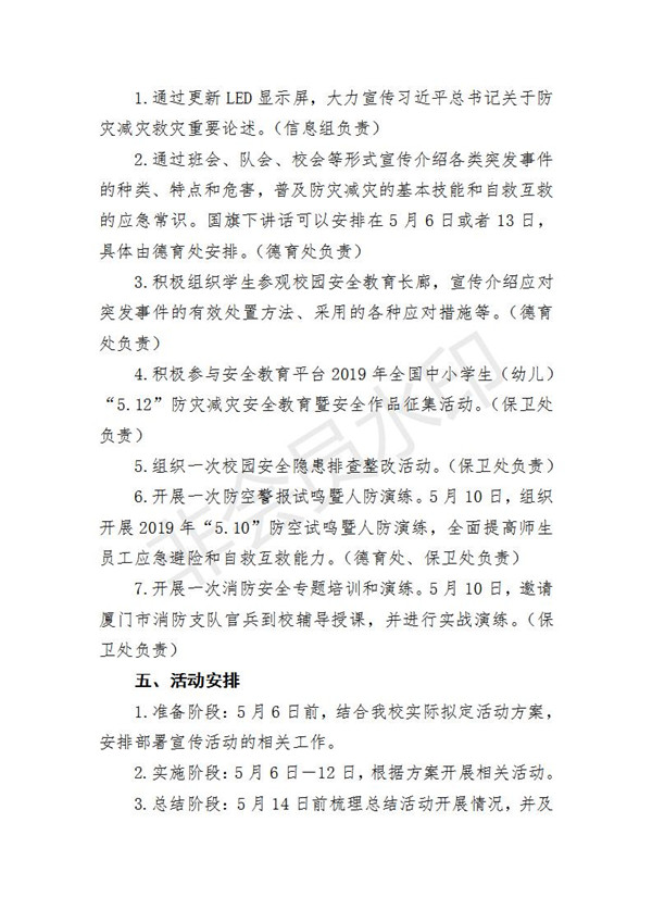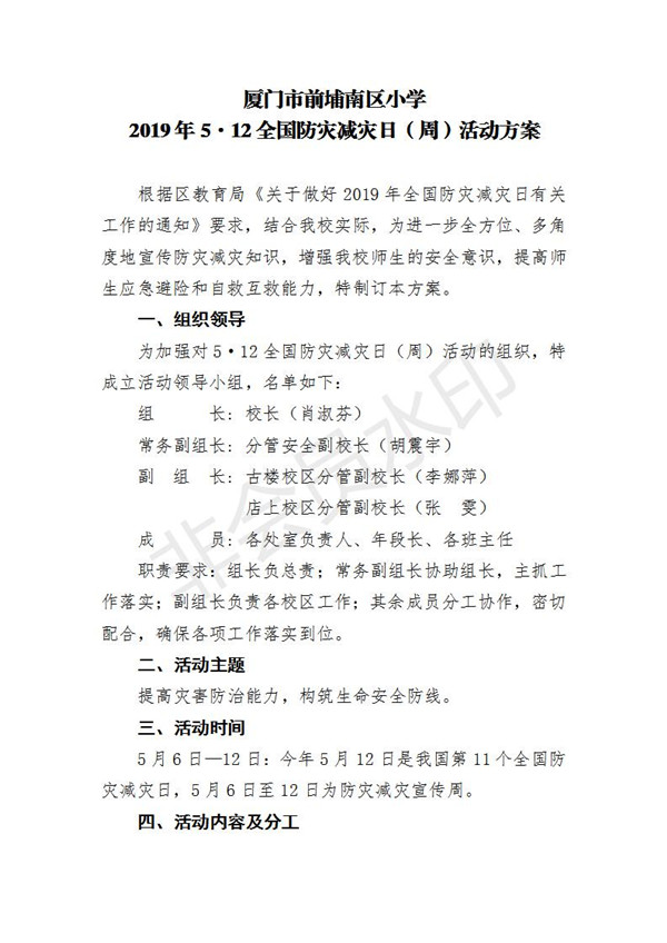 提高灾害防治能力,构筑生命安全防线。今年5月12日是我国第11个全国防灾减灾日,5月6日至12日为防灾减灾宣传周。为贯彻落实国家减灾委《关于做好2019年全国防灾减灾日有关工作的通知》、省减灾委《福建省减灾委员会关于认真做好2019年全国防灾减灾日有关工作的通知》及厦门市减灾委《关于做好全国防灾减灾日有关工作通知》文件精神,根据区教育局《关于做好2019年全国防灾减灾日有关工作的通知》要求,我校结合实际,积极、主动、科学、有效地开展了一系列丰富多彩的防灾减灾宣传教育和演练活动,并取得了良好的效果。