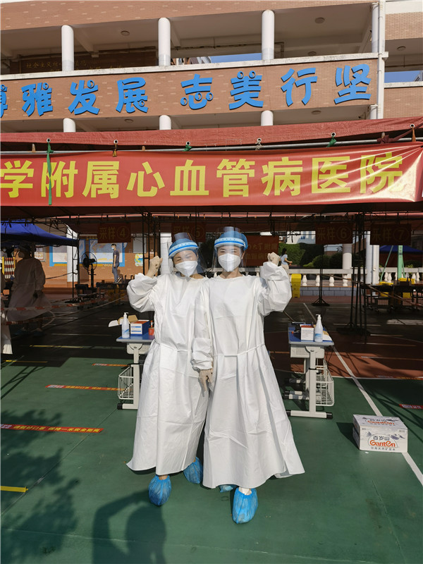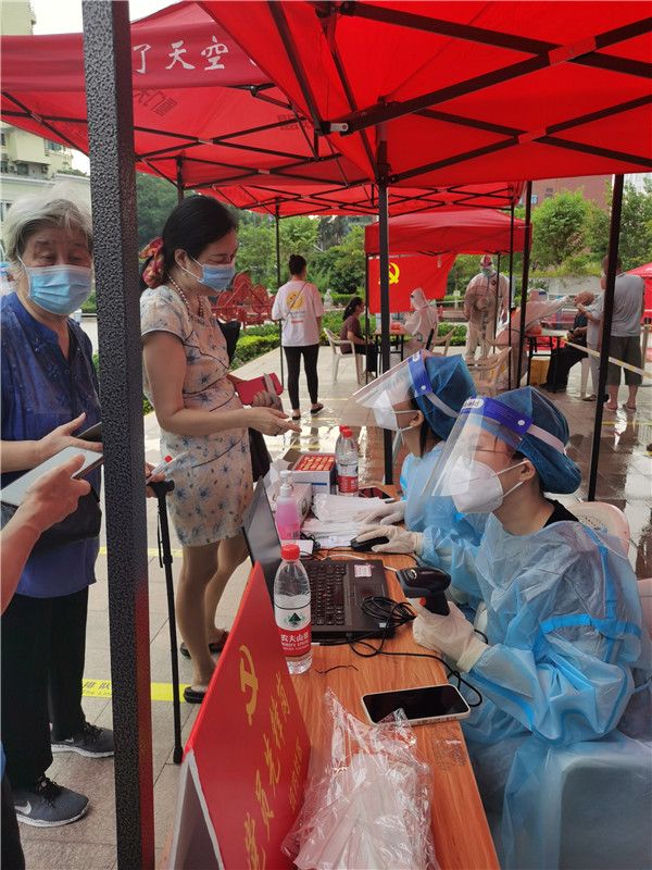 2021年9月13日,前埔南区小学古楼校区再次被征用作为核酸检测点。冒着滂沱大雨,南小行政团队连夜迅速开展组织工作,布置会场,组织志愿者。9月14日,志愿者们穿上防护服,戴上防护面罩,有条不紊地与医护人员一道战斗在抗疫的最前沿。