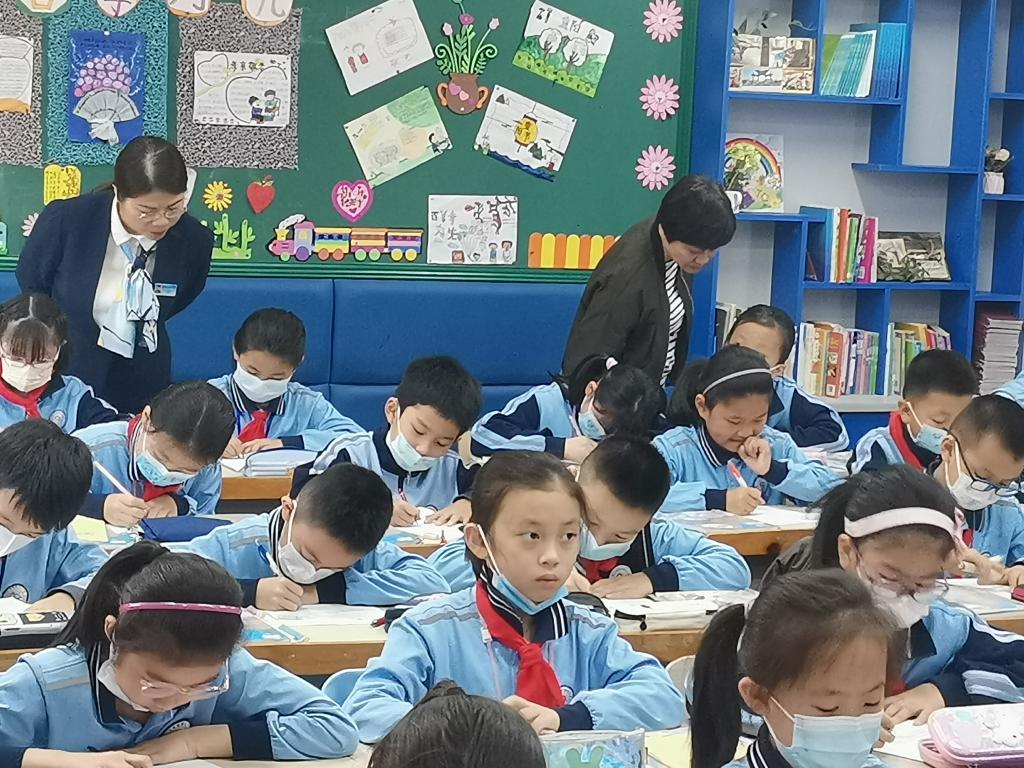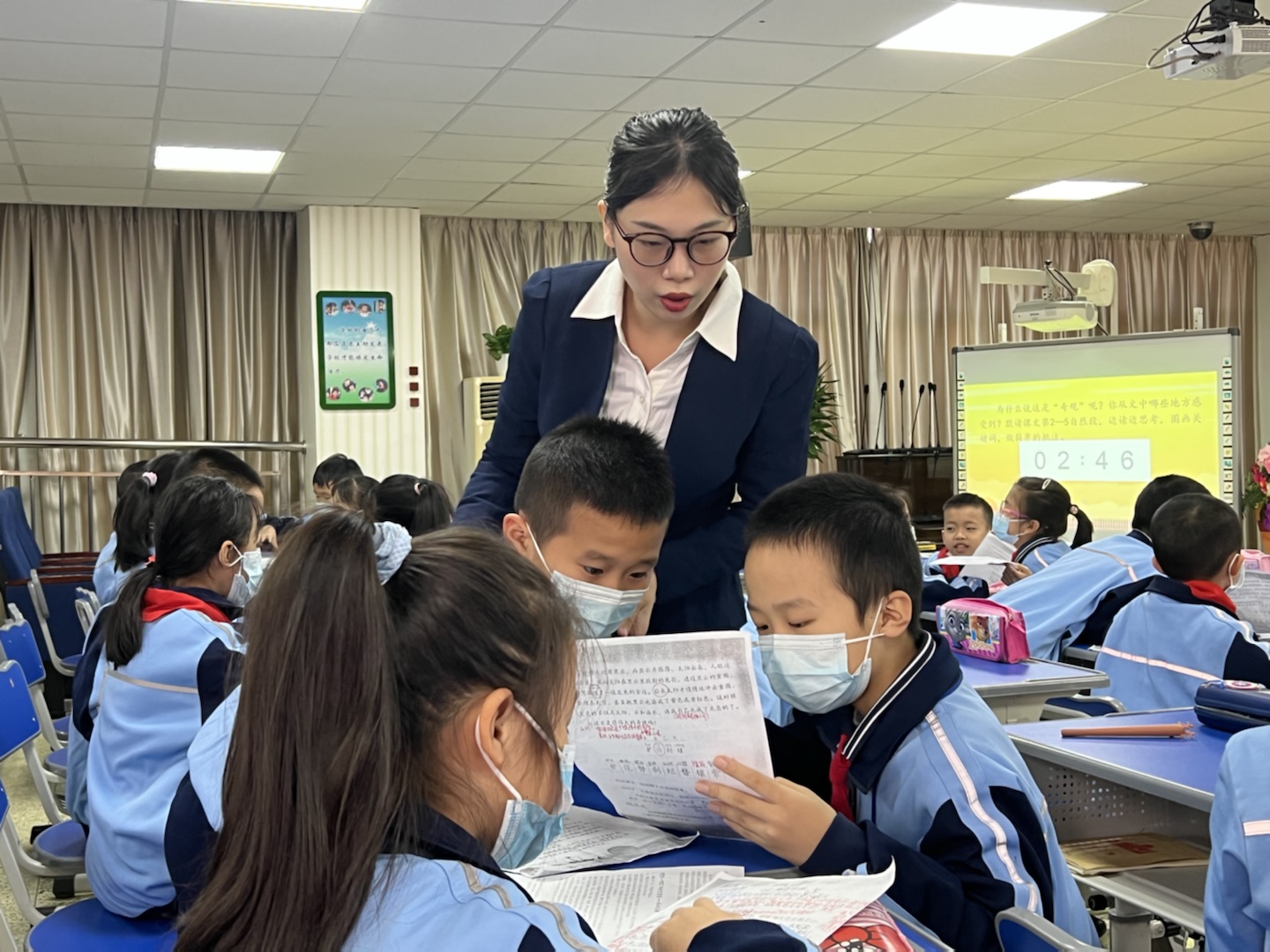 语文教研员蔡维真老师走进了两位语文老师的课堂,她认为前埔南区小学作为曾经的“新基础教育”研究的基地实验校,从研究中受到正向的引导,新基础的先进理念悄然地浸润着课堂,教师和学生均呈现出良好的精神的面貌。蔡老师充分肯定两位老师在授课过程中能充分关注学生的学习状态,及时捕捉学生课堂生成的资源,并转化资源引导学生进行更深层次的思维活动。课堂中,学生不仅发言精彩,而且小组合作学习活动规范,充分体现了推进性和分享互动感。她认为这是两节富有活力、张扬学生个性的课堂。同时,蔡老师也对语文教研组提出了期许:在语文校本作业设计时能基于“双减”政策背景,聚焦研修的主题,并融合前埔南区小学“博雅”办学特色,将“教学评”统整在一起,打造具有前埔南区小学语文学科特色的品牌项目!