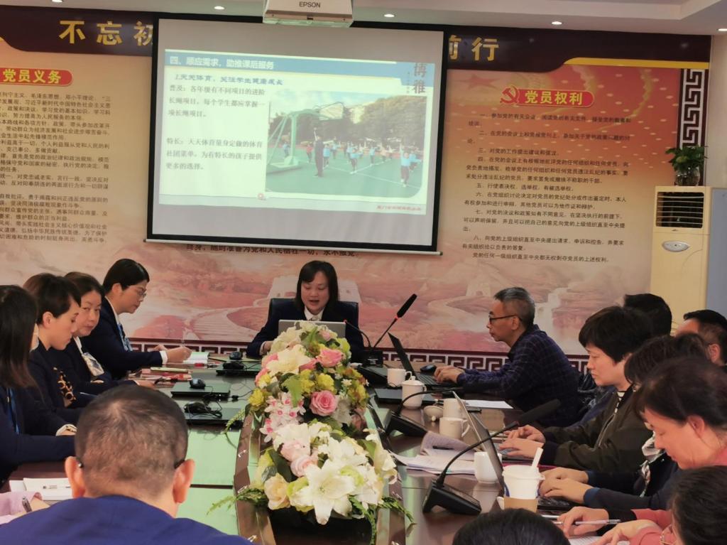学校教务处刘琳晖主任以“管理增研效,双减促成长”为主题,向思明区进修学校的领导和专家团汇报学校教育教学工作。她从“落地生根,提升教学质量”“提质增效,优化作业管理”“与时俱进,改革评价方式”“顺应需求,助推课后延时”四个方面进行阐述,深入细致地汇报了在五项管理”和“双减”文件精神指导下,学校优化教学、作业、评价、评价等工作,推进教学管理规范化、科学化的具体措施和工作成效。我校“博求融通,雅育自觉”的办学特色,扎实的工作作风得到了与会专家团的一致认可。