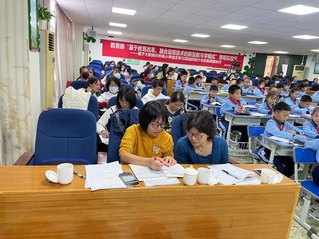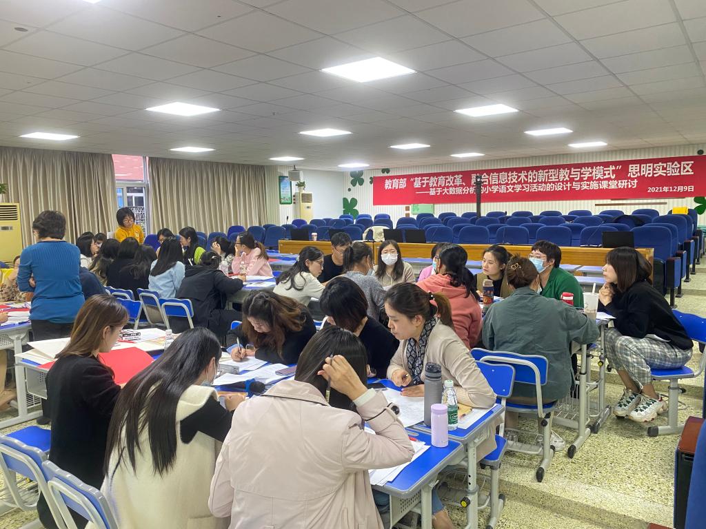 为实践教育部“基于教育改革、融合信息技术的新型教与学模式”,2021年12月9日下午,在前埔南区小学电教室开展了基于大数据分析的小学语文学习活动的设计与实施课堂的研讨活动。区教研员蔡维真老师组织且主持了本场活动。课题组的成员们明确分工,实时记录,并在课后展开了精彩的研讨。我们还邀请了向科小学“跨校协作教研”团队共同参与本次活动。