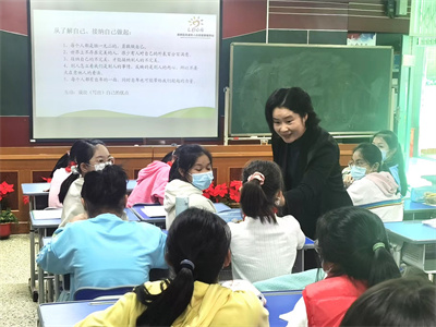 一开场,廖老师就讲了女孩子们最为关心的话题——女生青春期的外貌变化。廖老师告诉大家,这些变化都很正常,我们不要因为自己的容貌而焦虑,要正确了解自己、接纳自己。我们每一个女生都有独属于自己的美,不要因为刻意模仿他人而丧失了自己的个性,学会欣赏自己、悦纳自己,我们的生活才会多姿多彩。