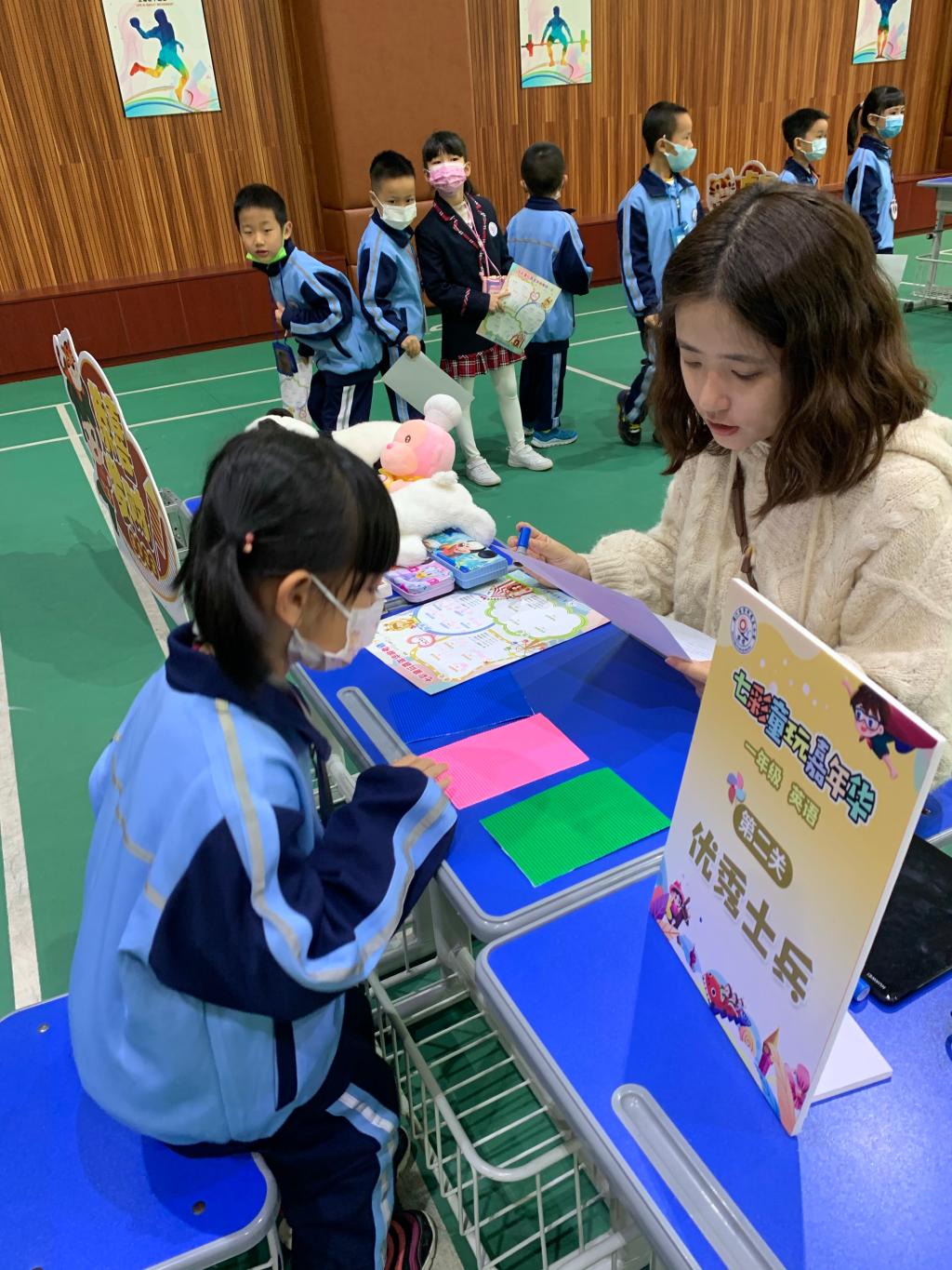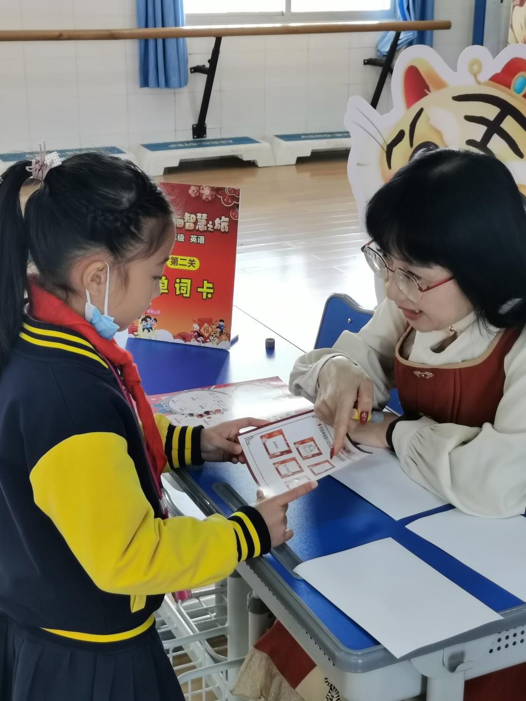 英语组精心设计了各种有趣的关卡,有“字母屋”“单词卡”“短语秀”和“英语角”,这些游戏集知识性与趣味性于一体。瞧!孩子们井然有序地拿着闯关卡排队。他们摩拳擦掌,跃跃欲试,准备大展身手呢!