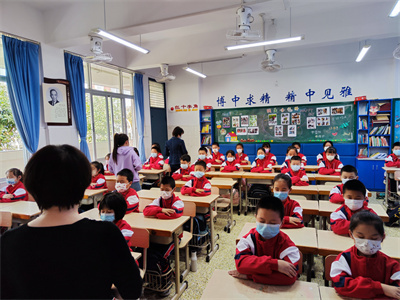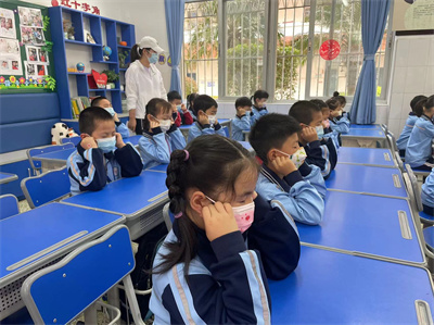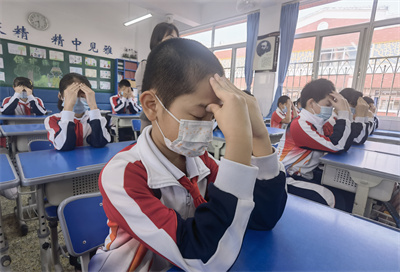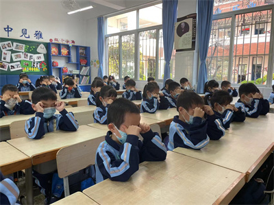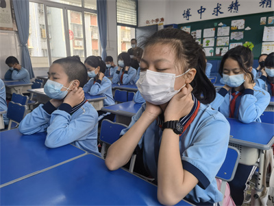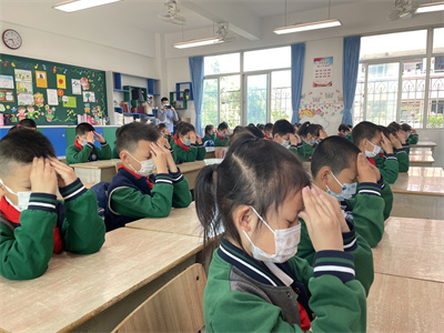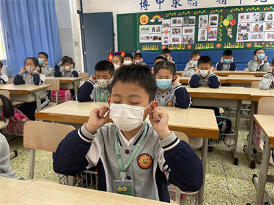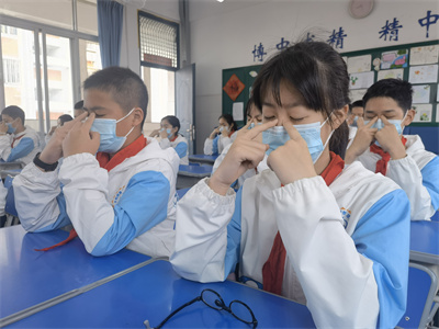 看!孩子们戴好口罩,端正地坐在座位上,随着眼保健操的音乐,准确而有节奏地按揉穴位,同学们动作整齐一致。班主任和任课老师时时关注并及时指出个别学生不规范的动作,给予纠正和指导。