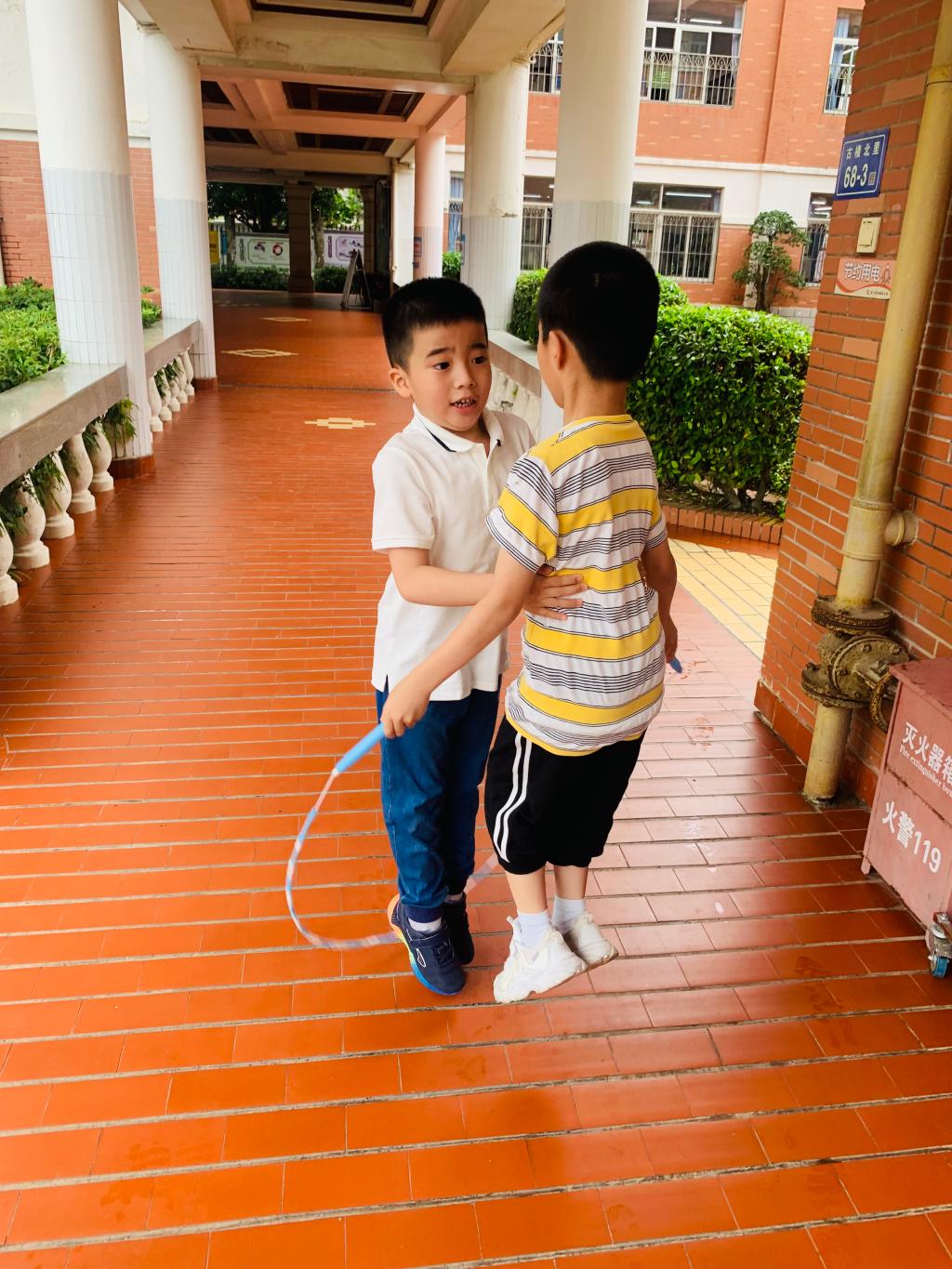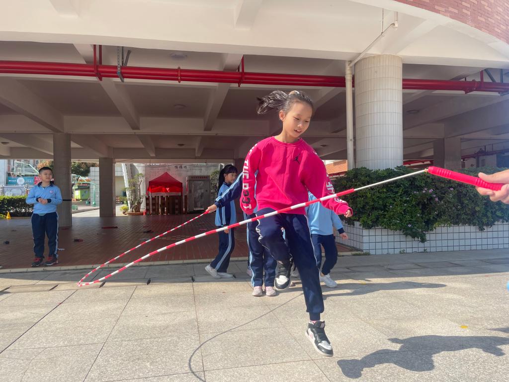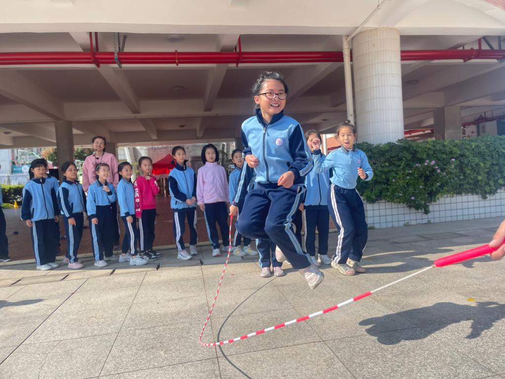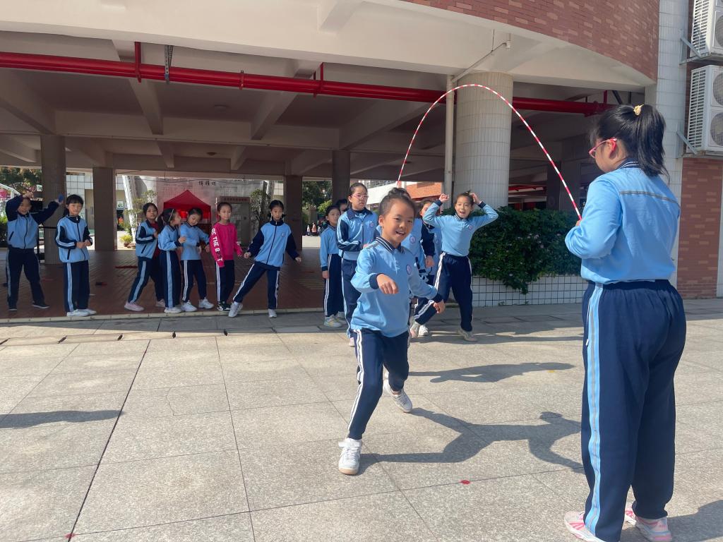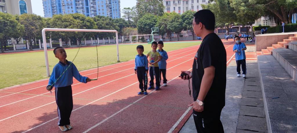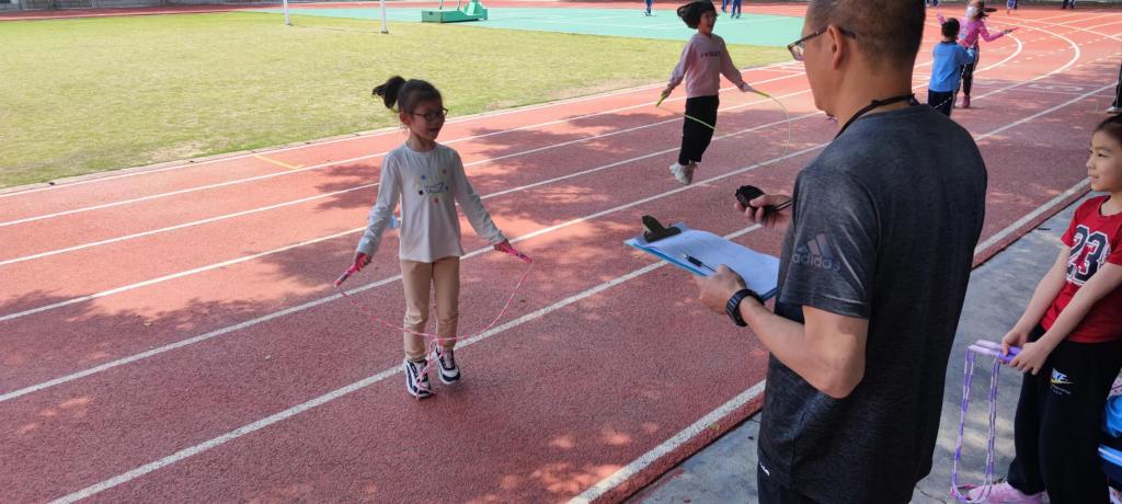 一到三年级1分钟单摇跳短绳,四到六年级30秒双摇跳,哨声一响,操场上一片欢腾的景象,只见一根根彩绳如银蛇飞舞,跳动的孩子像彩蝶纷飞。
