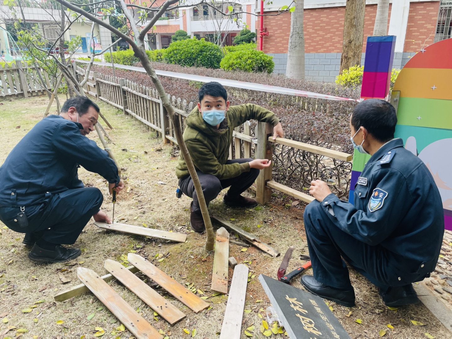 郑校长亲自带领行政和保安叔叔维修栅栏。