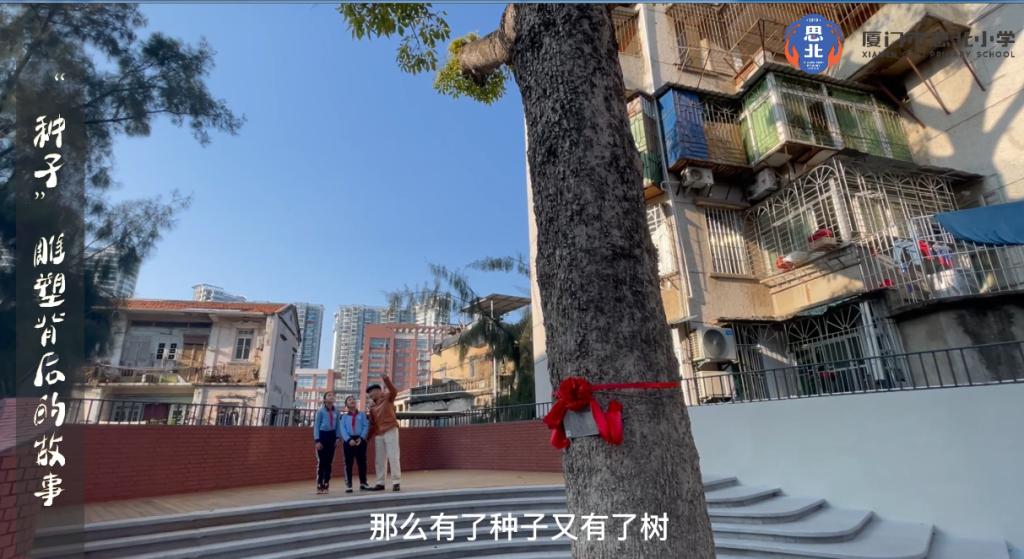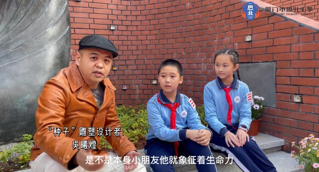 学生代表张乐平与周云鹭采访“种子”雕塑设计者吴曦煌老师,他向我们讲述了这座雕塑诞生的故事——雕塑象征着思北小学小朋友们的生命力和活力。这颗种子,它不是一个单独的一个雕塑,它跟身后的百年木棉形成一个整体,成为一个整体的公共艺术。种子与树,便是一个生命的循环。
