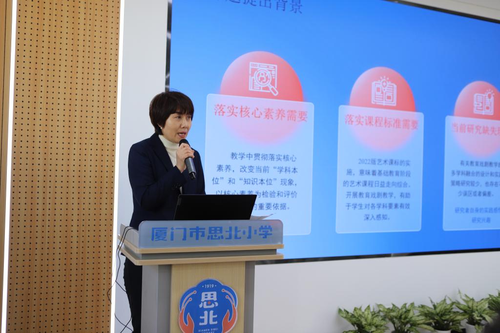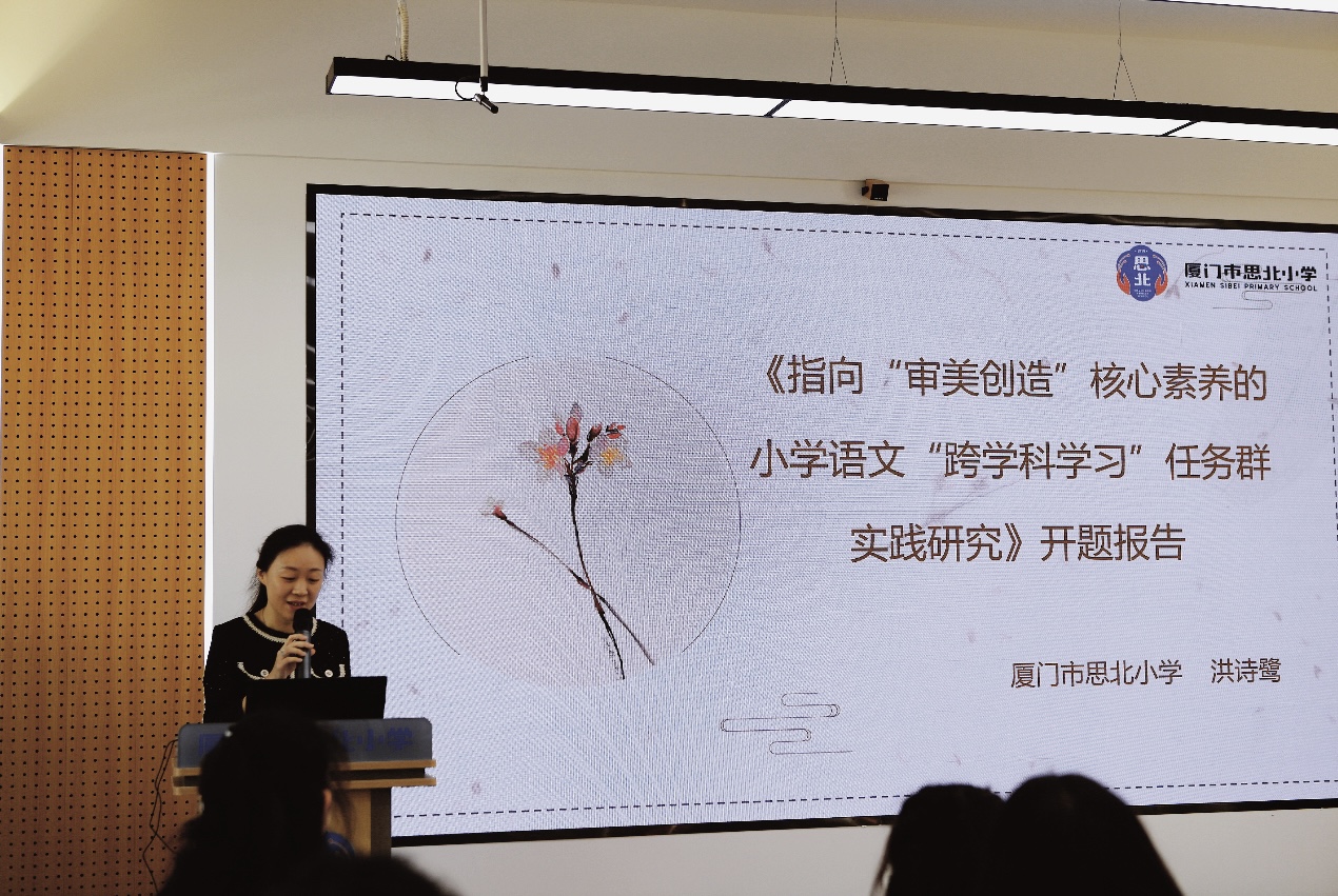 课题“指向“审美创造”核心素养的小学语文“跨学科学习”任务群实践研究”的主持人洪诗鹭从研究背景、核心概念、国内外同一研究领域的研究现状与价值、研究目标内容方法、组织分工进度安排、预期成果等方面进行阐述。