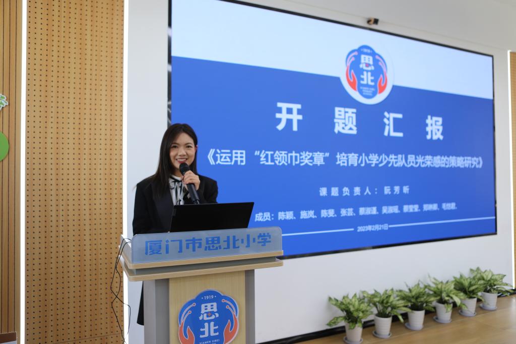 课题“运用‘红领巾奖章’培育小学少先队员光荣感的策略研究”的主持人阮芳昕就课题的研究背景、核心概念、研究现状与研究价值、研究目标、内容与方法作了详细汇报。