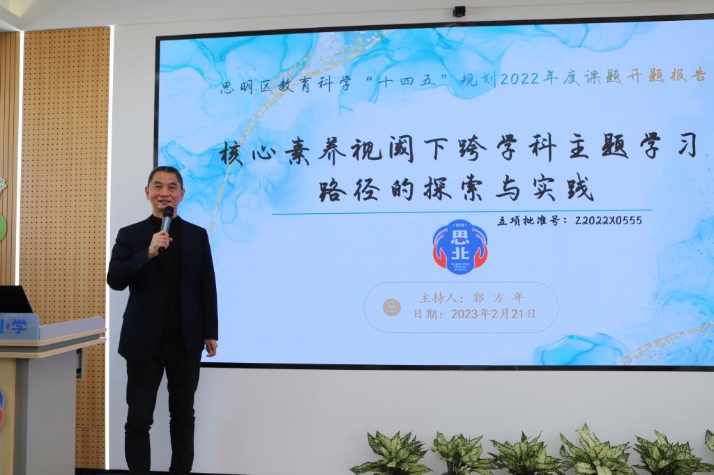首先,由“核心素养视域下跨学科主题学习路径的探索与实践”课题主持人郭方年做开题报告,他分别从选题背景、研究设计、预期成果、研究条件与困难等方面展示了课题的基础框架与现实意义。