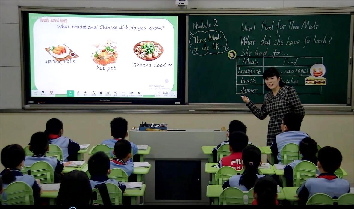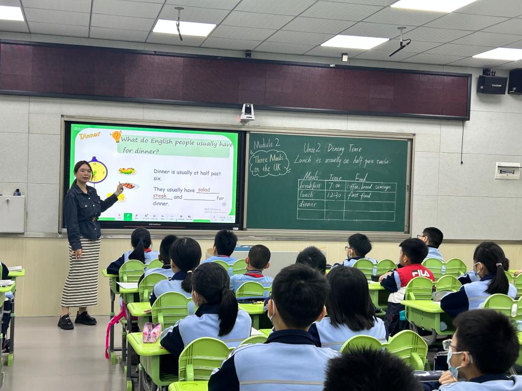 第一课时“Food for Three Meals”由黄吉瑶老师执教。黄老师通过watch and match Lingling’s Meals,在学习理解活动中引导学生梳理Lingling在邮件中提及的昨日自己在英国的一日三餐,在词汇教学中通过图文并茂、检测词义理解等方式帮助学生掌握本课新授词汇,并拓展了traditional Chinese dish;在应用实践活动中,引导学生在板书的提示下复述Lingling昨日的一日三餐;在迁移创新活动中,黄老师加入了视频British Food,介绍了英国典型食物full English breakfast, BLT sandwich以及fish and chips,并通过观看中国美食视频引导学生对中英食物进行对比和评价“What do you think of English food and Chinese food?”,感受delicious/traditional/healthy等特点,最后通过回复邮件的语境,引导学生谈论自己昨日的一日三餐,促进单元目标的达成。