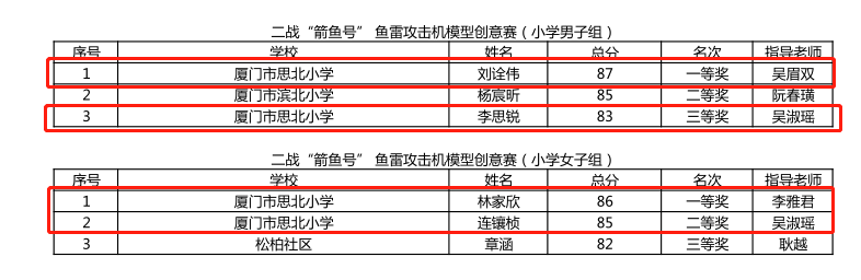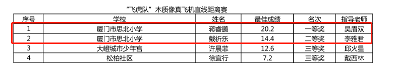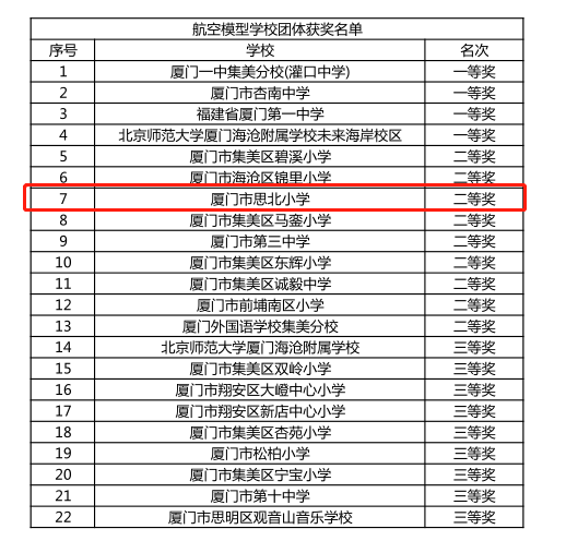 在本次比赛中,8人参加空模比赛,7人次获得奖项,荣获10个奖次。一等奖3名,二等奖2名,三等奖5名,学校也首次荣获厦门市青少年航天航空模型锦标赛团体成绩二等奖的荣誉。