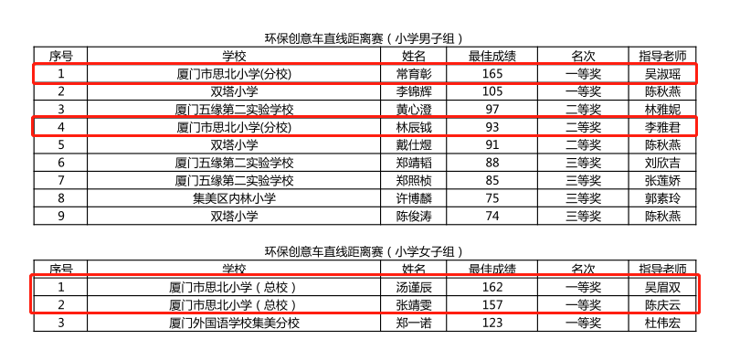 车辆模型比赛中,10人参加比赛,10人次获得奖项,荣获11个奖次。一等奖4名,二等奖3名,三等奖4名,学校也荣获厦门市青少年车辆模型锦标赛团体成绩二等奖的荣誉。