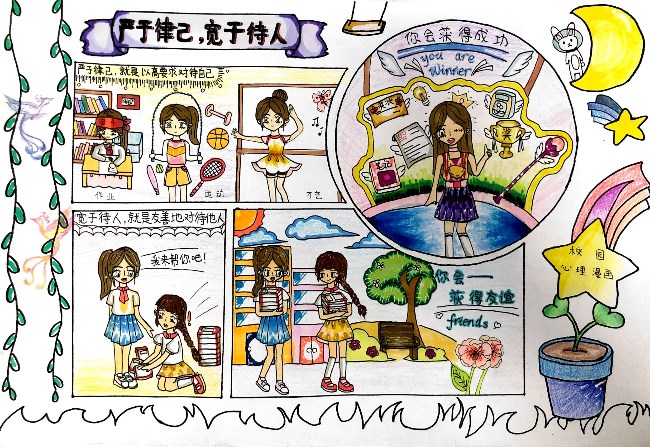 学校还特别关注学生的心理健康成长,开设心理信箱和每周二校本十分钟的心理电台,并设立心理健康教育活动月,本年度绘制“严于律己,宽以待人”的主题心理漫画,以这样一种集通俗性、幽默型、教育性于一体的心理辅导方式,大力弘扬社会主义核心价值观,营造积极向上的校园文化,提升学生乐观坚韧的心理品质。