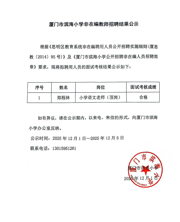 厦门市滨海小学非在编教师招聘结果公示