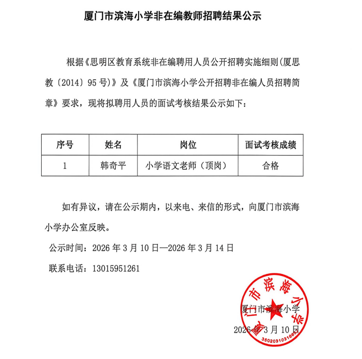 厦门市滨海小学非在编教师招聘结果公示