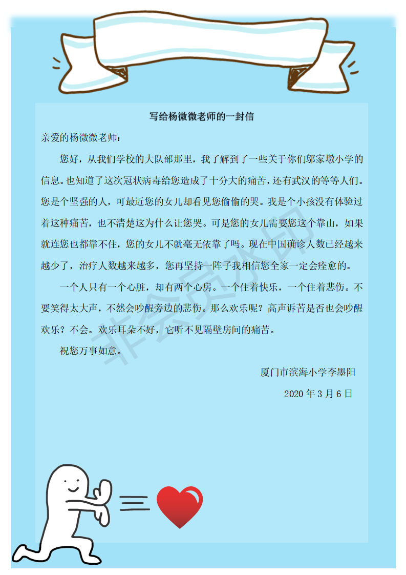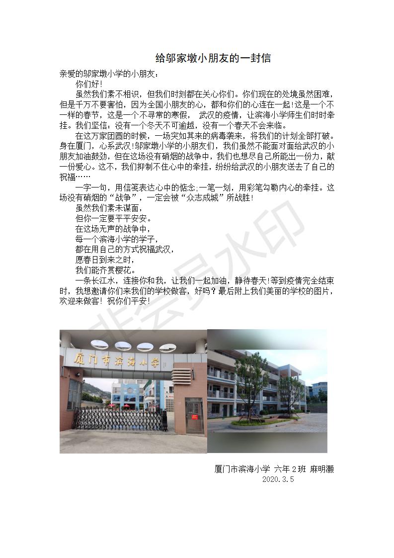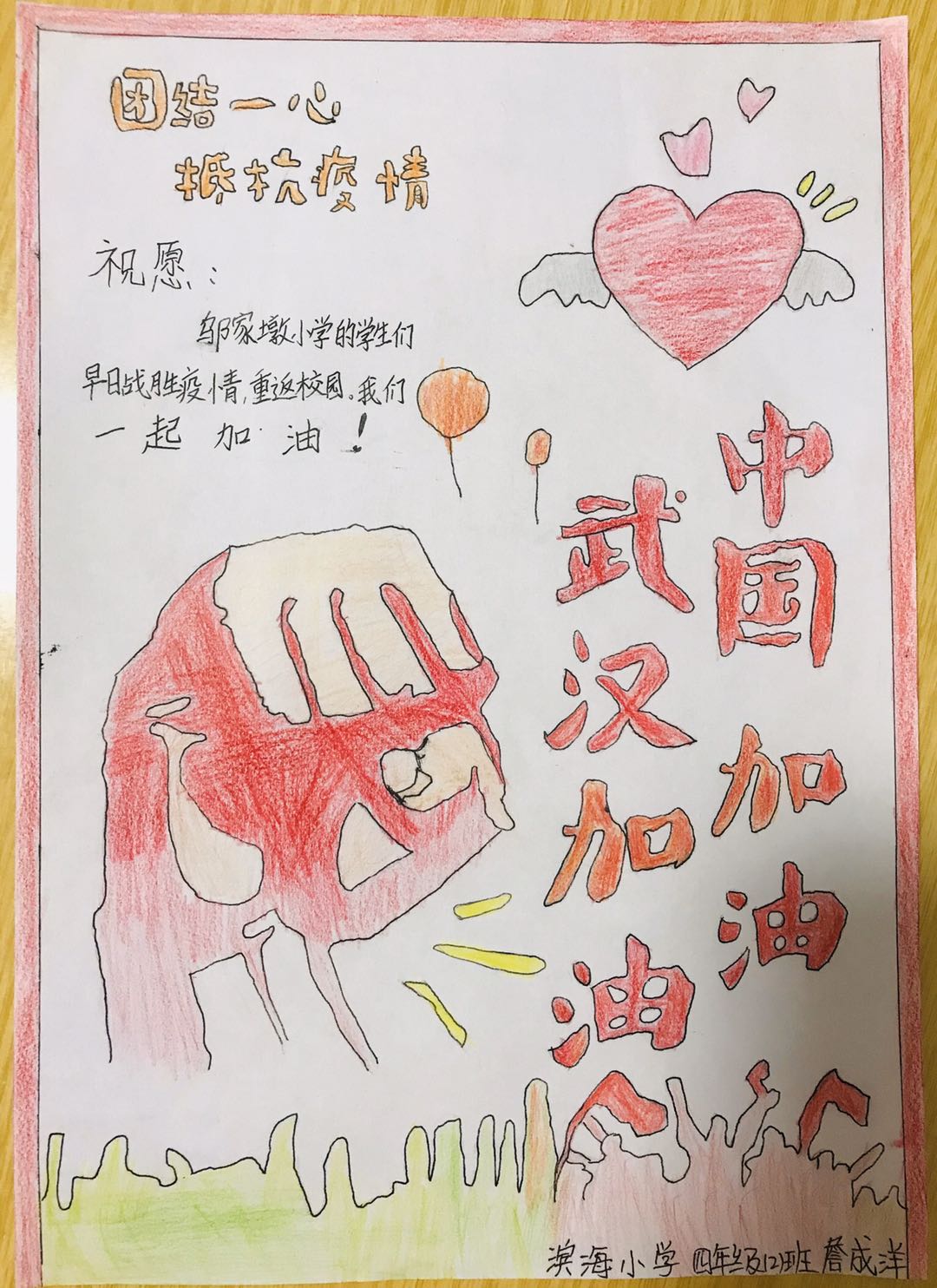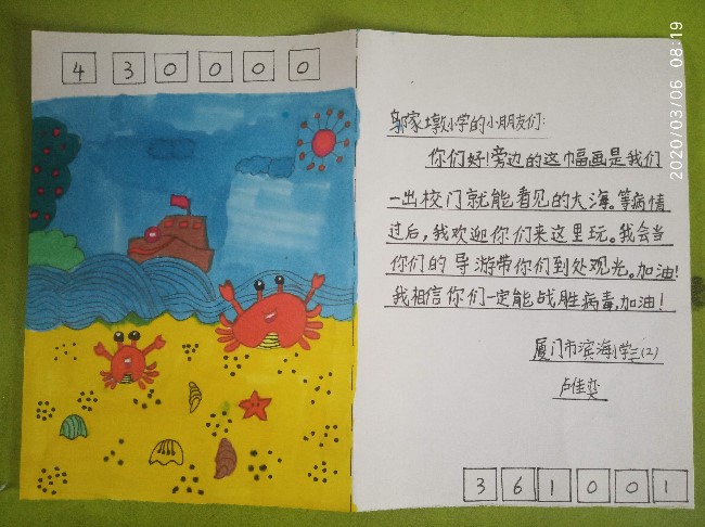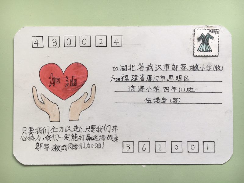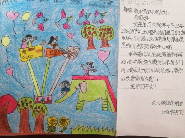三、四年级的同学们拿出手中的画笔,将自己对邬家墩小学同学的祝福融汇于画中,一笔一划中饱含对未来美好生活的期盼,武汉、厦门,我们都是一家人。
